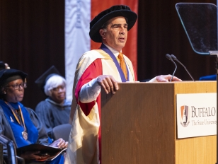 Gerard J. Puccio, Ph.D., SUNY distinguished professor of creativity and change leadership, presented the Convocation Address at Academic Convocation, a tradition that recognizes select faculty and staff members with President’s and Chancellor’s Awards for Excellence for their extraordinary efforts on behalf of the university, recognizes significant awards and major grants of faculty and staff members, and welcomes all new employees to campus. Interim President Bonita R. Durand, Ph.D., offered congratulatory remarks.